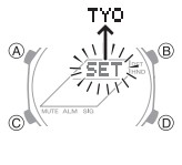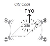 - Nella Timekeeping Mode, tenere premuto A finché l'indicatore lampeggiante SET non scompare dal display e il codice della città attualmente selezionato appare sul display.