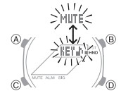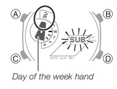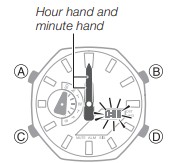- Premere nuovamente B e C contemporaneamente farà sì che le lancette tornino alle loro posizioni normali (indicazione dell'ora normale).