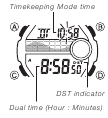- L'indicatore DST nella schermata della Modalità Ora Doppia indica che l'Ora Legale è attiva per l'ora della Modalità Ora Doppia.