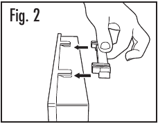 - Installare il nuovo filtro Aer1® nell'unità. Questo modello utilizza una linguetta di sospensione e clip per il filtro per garantire che il filtro sia correttamente posizionato. Prima di sostituire il filtro, assicurarsi che la linguetta di sospensione sia saldamente in posizione. La clip può essere attaccata alle linguette del filtro solo in un modo. La clip del filtro dovrebbe scorrere facilmente sulla linguetta di sospensione del filtro con solo una piccola pressione. NON usare forza durante il fissaggio della clip al filtro. (Fig. 2)