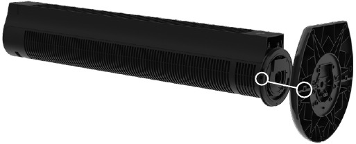 - Assemblare la base nella parte inferiore della torre allineando il perno sul fondo della torre con l'incavo sul fondo della base (contrassegnato da una freccia). Assicurarsi che il cavo sia instradato correttamente attraverso il foro sulla base.