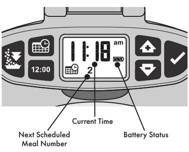 ![]() | MEAL SCHEDULE (Programma pasto) - Premere per 2 secondi per programmare l'ora in cui erogare ogni pasto. È possibile programmare da 1 a 6 pasti al giorno con incrementi di 15 minuti. Premere e rilasciare per visualizzare il prossimo orario dei pasti programmato. | |