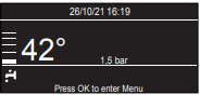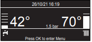 Controllare la pressione dell'acqua sul manometro e assicurarsi che la cifra sia compresa tra 0,6 e 1,5 bar quando l'impianto è freddo. Se la pressione è appena al di sotto del valore minimo, il display richiederà una procedura di riempimento - vedere la nota sottostante.