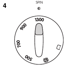 "No spin" (Nessuna centrifuga). Le velocità vengono applicate per i programmi "white-" (bianchi) e "coloured" (colorati). - La posizione 1300 equivale a 900 giri/min per i programmi sintetici e lana e 700 giri/min per il programma di lavaggio delicato.