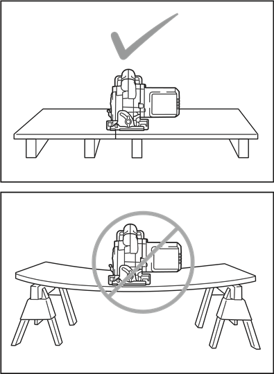 - Supportare i pannelli di grandi dimensioni per ridurre al minimo il rischio di pizzicamento della lama e contraccolpo. I pannelli di grandi dimensioni tendono a incurvarsi sotto il proprio peso. I supporti devono essere posizionati sotto il pannello su entrambi i lati, vicino alla linea di taglio e vicino al bordo del pannello.