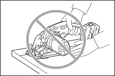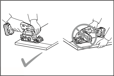 - Tenere SEMPRE l'utensile saldamente con entrambe le mani. Non posizionare MAI la mano o le dita dietro la sega. In caso di contraccolpo, la sega potrebbe facilmente saltare all'indietro sopra la mano, causando gravi lesioni personali.
