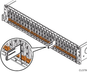 Enclosure a 25 unità: sotto il LED di stato dell'alimentazione situato tra gli slot per unità 16 e 17.