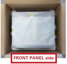 - Posizionare il prodotto nella scatola con il pannello frontale rivolto verso il cuscinetto "FRONT" (ANTERIORE).