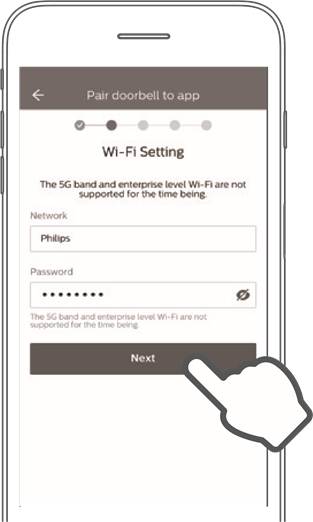 - Open the door viewer and enter into the "Scan QR Code" menu via the mobile phone, then choose available WIFI, input password and click on "Next" to generate a QR code. (Есік қарау құралын ашып, ұялы телефон арқылы "QR кодын сканерлеу" мәзіріне кіріңіз, содан кейін қолжетімді WIFI таңдаңыз, құпия сөзді енгізіңіз және QR кодын жасау үшін "Келесі" түймесін басыңыз.)