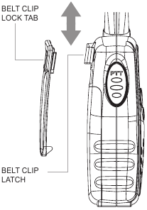 - Радионың артқы жағы сізге қарап тұрғанда, оңай қол жеткізу үшін белдік қыстырғышын (төмендегі диаграмманы қараңыз) алыңыз, содан кейін жоғарғы ортасын басып, оны радиодан төмен сырғыту арқылы Батарея қақпағын алыңыз.