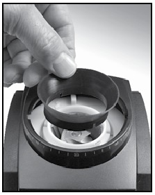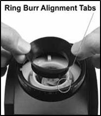 Қара реттеу сақинасының толығымен сағат тіліне қарсы бұрылғанына көз жеткізіңіз. Диірмендегі қызыл қойындыны қара реттеу сақинасындағы тік бұрышты ойықпен туралап, диірменді ауыстырыңыз. Оның дұрыс орналасқанына көз жеткізу үшін сақиналы диірменді шайқаңыз және қатты итеріңіз.