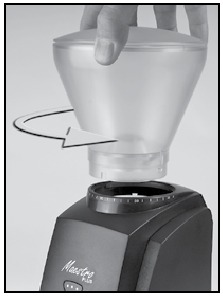 Дәнді салғышты ауыстыру үшін салғыштың табанындағы екі қойындыны (оң жағындағы кішкентай қойындысы бар) кофе тартқыш корпусының жоғарғы жағындағы тиісті саңылауларымен туралап, салғышты кофе тартқышқа салыңыз. Салғыш орнына келгеннен кейін, оны қажетті тарту параметріне дейін сағат тілімен бұраңыз.
