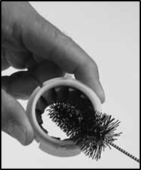 Сақиналы диірмендегі және қозғалтқыш корпусының ішінде орнатылған орталық конустық диірмендегі кез келген бос кофе қалдықтарын кетіру үшін қылшақты (кофе тартқышпен бірге жеткізіледі) пайдаланыңыз. Силикон тығыздағышты жылы сабынды сумен жуып, құрғатыңыз.