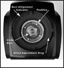 Кофе тартқышқа жоғарыдан қарасаңыз, ортасында конус тәрізді диірменді және конус тәрізді диірменнің түбінде айналатын төрт қалақшасы бар ескекті дөңгелекті көресіз (№ 2 фотоны қараңыз). Тарту кезінде бұл қалақшалар тартылған кофені тарту камерасынан шығарады. Тартылған кофе қалақшалардың арасында тығыз орналасуы мүмкін. Қалақшалардың арасында орналасқан кез келген кофе ұнтағын кетіру үшін үлкен қағаз қыстырғышты (немесе соған ұқсас нәрсені) түзеңіз. Барлық кофе алынып тасталғаннан кейін, барлық төрт қалақшаның бар екеніне және тарту камерасының қабырғасына жеткеніне көз жеткізіңіз. Егер ескекті дөңгелек сынған немесе тозған болса, ескекті дөңгелекті қалай сатып алуға және ауыстыруға болатынын білу үшін www.baratza.com сайтындағы ақаулықтарды жою бөліміне өтіңіз.