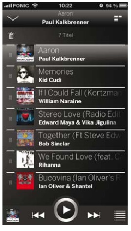 Жақында естілген барлық атаулар автоматты түрде ойнату тізіміне қосылады. Бұл тізімге әрқашан және барлық жерде оң жақтағы тізім белгішесі арқылы жетуге болады. Бұл тізімде атауларды жоюға немесе жылжытуға болады. Ол үшін қоқыс белгішесі немесе әрбір тізім элементінің сол жақ бөлігі пайдаланылады. Белсенді аймақтар ойнату тізіміне өтуге ғана мүмкіндік бермейді - бір рет басу арқылы басты экранға немесе ойнатқышқа өтесіз.