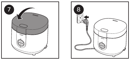 - Күріш пісіргіштің қақпағын жабыңыз (7-сурет), штепсельдік ұшты розеткаға салыңыз (8-сурет).