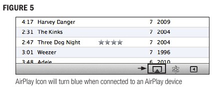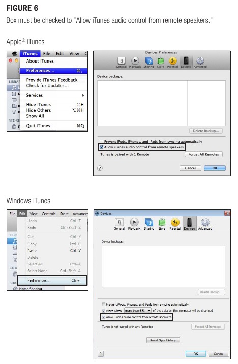 Компьютеріңізде iTunes-ті ашыңыз, iTunes төменгі жолағындағы "AirPlay" белгішесін тауып, оны басыңыз. Ол сізге iTunes-ті компьютер динамиктерінде немесе Klipsch_G17 xxxxxx (немесе орнату кезінде өзгертсеңіз, басқа атау) ойнату опциясын береді (5-сурет). Klipsch_G17 xxxxxx түймесін басыңыз, содан кейін ойнату үшін ән таңдаңыз; iTunes Klipsch_G17 xxxxxx-ке қосылып жатқанын көрсетеді және сіздің музыкаңыз G-17 Air-де анық ойналады. G-17 Air-ге iTunes дыбыс деңгейін басқаруға рұқсат беру үшін, "Edit" (Windows пайдалансаңыз) немесе "iTunes" (Mac пайдалансаңыз) таңдап, содан кейін "Preferences" таңдаңыз. "Preferences" ішінде "Devices" қойындысын таңдап, "Allow iTunes audio control from remote speakers" опциясын таңдаңыз (6-сурет).