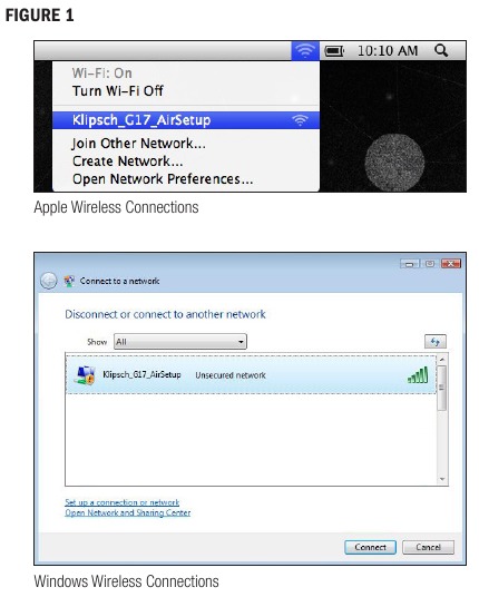 - Компьютеріңізде немесе Mac-та қолжетімді желілерді іздеу үшін Сымсыз Қосылым Утилитасын ашыңыз. Klipsch G-17 Air Setup болуы керек. (Егер ол тізімде пайда болмаса, қолжетімді желілер тізімін жаңарту үшін жаңартуды басыңыз.) Klipsch_G-17_AirSetup таңдап, қосылуды басыңыз (1-сурет.) Диод күлгін түске айналғаннан кейін, 4-қадамға өтіңіз.