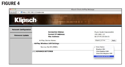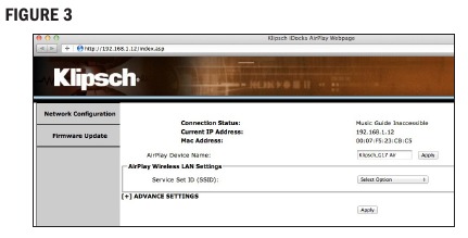 - IP мекенжайын енгізгеннен кейін, браузерде Klipsch G-17 Air орнату экраны пайда болады (3-сурет). Klipsch G-17 Air атауын басқа нәрсеге өзгерткіңіз келсе, "AirPlay Device Name" жолағына таңдалған атауды теріп, "Apply" түймесін басуға болады. Қандай атауды таңдасаңыз да, бұл атау iTunes-те немесе үйлесімді iOS құрылғысында G-17 Air-ге сымсыз музыка ағыны үшін қосылу опциясы ретінде пайда болады. "Apply" түймесін басқаннан кейін, бастапқы бетке оралу үшін сол жақ жолақтағы "Network Configuration" түймесін басыңыз, 6-қадамға өтіңіз.