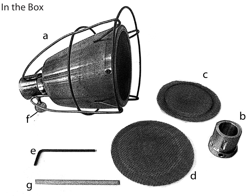 Бұл бумада тек бір (1) Searzall (a), бір (1) жең адаптері (b, алдын ала бекітілген болуы мүмкін), бір (1) қосымша ішкі экран (c), бір (1) қосымша сыртқы экран (d), бір (1) 2 мм аллен кілті (e), бір (1) алдын ала бекітілген бұранда (f) және бір (1) Searzall аралықты реттеу құралы (сіріңке, g) бар. Алау кірмейді, бірақ пайдалану үшін қажет.
