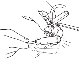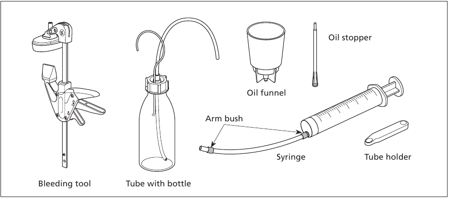 7 мм кілтті орнына қойыңыз, шприцті маймен толтырыңыз, содан кейін түтікті ауа шығару штуцеріне жалғаңыз. Ауа шығару штуцері мен түтікті түтік ұстағышпен бекітіңіз, содан кейін ауа шығару штуцерін 1/8 бұрышқа бұрап ашыңыз. Майды қосу үшін шприцтің поршенін итеріңіз. Май құйғыштан май шыға бастайды. Шығып жатқан маймен араласқан ауа көпіршіктері қалмағанша май қосуды жалғастырыңыз.