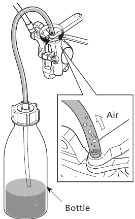- 7 мм кілтті орнына қойыңыз, содан кейін бөтелкесі бар түтікті суретте көрсетілгендей ауа шығару штуцеріне бекітіңіз.