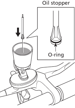 Егер бұл сақталмаса, тіреуіштің ішіндегі маймен ауа көпіршіктері араласып қалуы мүмкін және ауаны шығару ұзағырақ уақытты алады. (Егер тұтқа үнемі қысылып, босатылса, барлық майды ағызып, қайтадан май қосыңыз.)