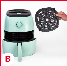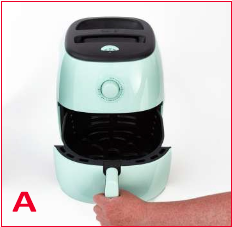 - Құрылғыны тұрақты, тегіс, ыстыққа төзімді бетке қойыңыз. Қытырлақ тартпаны ауа фритюрницасынан алыңыз (А фотосы).