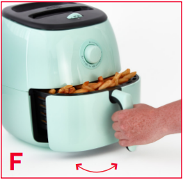 Ауа фритюрницасы автоматты түрде қуыруды бастайды және таймер реттегіші кері санауды бастайды. Индикатор шамы пісіру кезінде жанады. - Біркелкі нәтижелер үшін кейбір тағамдарды дайындау уақытының ортасында араластыру қажет. Ұсыныстар үшін температура және уақыт кестесін қараңыз. Бұл үшін қытырлақ тартпаны құрылғыдан шығарып, оны ақырын бүйірден бүйірге қарай шайқаңыз (F фотосы).