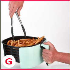 Қытырлақ тартпа мен қытырлақ науа ыстық болады. Қытырлақ тартпаны тек қытырлақ тартпа тұтқасынан ұстаңыз. - Тағам пісіріліп болғаннан кейін, қытырлақ тартпаны ыдысқа немесе тәрелкеге босатыңыз. Үлкен немесе майлы заттарды алу үшін оларды қысқышпен қытырлақ тартпадан шығарыңыз (G фотосы). Артық май қытырлақ тартпаның түбінде жиналады. Артық майды тастамас бұрын құрылғының суығанына рұқсат етіңіз.