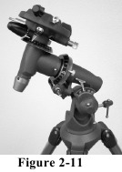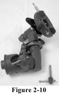 - Экваторлық бекіткішті қораптан алыңыз (2-10-сурет). Бекіткіште шағын енді реттеу бұрандасы (құлыптау болты) бекітілген. Үлкен енді реттеу бұрандасы (2-10-сурет) тесікке бұралады.