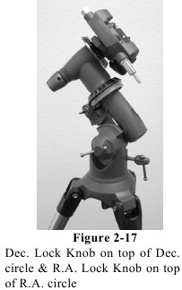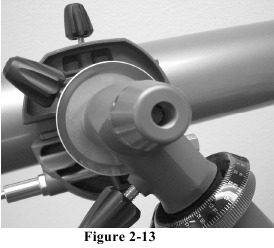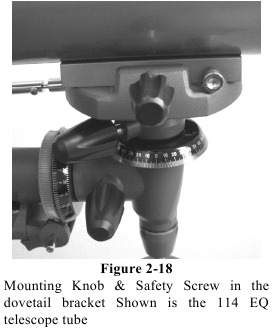 Телескоптың оптикалық түтігі бекіткіштің жоғарғы жағындағы қарлығаш құйрығы сырғыма жолағы арқылы бекіткішке бекітіледі (2-16-сурет). 130 EQ Ньютондық үшін бекіту жолағы түтік сақиналарына бекітілген тіреуіш болып табылады. 90 EQ рефракторы үшін бекіту жолағы телескоп түтігінің төменгі жағына бекітілген. Оптикалық түтікті бекітпес бұрын, деклинация мен тік көтерілуді құлыптау тұтқаларының қатайтылғанына көз жеткізіңіз (2-17-сурет). Содан кейін, енді реттеу бұрандаларының (1-1 және 1-2-суреттер) қатайтылғанына көз жеткізіңіз. Бұл телескоптың оптикалық түтігін бекіту кезінде бекіткіштің кенеттен қозғалмауын қамтамасыз етеді. Сондай-ақ, объективтің линза қақпағын (рефрактор) немесе алдыңғы ашылатын қақпақты (Ньютондық) алыңыз. Телескоп түтігін орнату үшін: