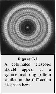 Артқы ұяшықта (7-1-суретте көрсетілген) коллимациялау үшін пайдаланылатын үш үлкен бармақ бұрандасы және айнаны орнында құлыптау үшін пайдаланылатын үш кішкентай бармақ бұрандасы бар. Коллимациялау бұрандалары негізгі айнаны еңкейтеді. Сіз әрқайсысын бірнеше айналымға кіші құлыптау бұрандаларын босатудан бастайсыз. Әдетте, 1/8 айналым тәртібіндегі қозғалыстар айырмашылықты жасайды, ал үлкен коллимациялау бұрандалары үшін шамамен 1/2 -ден 3/4 -ге дейін айналым ең көп қажет болады. Бір уақытта бір коллимациялау бұрандасын бұраңыз және коллимациялау құралымен немесе окулярмен коллимацияның қалай әсер ететінін қараңыз (төмендегі келесі абзацты қараңыз). Біраз тәжірибе қажет болады, бірақ сіз ақырында қалаған орталықтандыруға қол жеткізесіз.