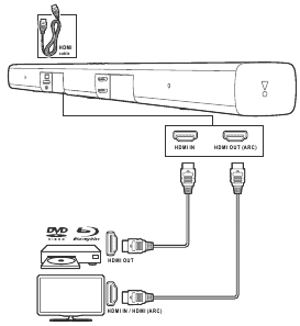 - Naudodami didelės spartos HDMI kabelį, prijunkite skaitmeninio įrenginio HDMI OUT jungtį prie soundbar'o HDMI IN jungties. Prijunkite soundbar'ą prie televizoriaus per HDMI OUT (ARC).