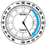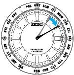 - Naudojant 24 valandų rodyklę ir besisukantį rėmelį, 22 miestų laikus skirtingose laiko zonose visame pasaulyje galima nuskaityti nuo ciferblato.