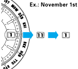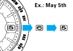 - Data pasikeičia tarp 23:45 ir 0:30, kai laikrodis veikia, ir tarp 21:00 ir 3:00, kai ji keičiama rankiniu būdu sukant rodykles. Todėl atkreipkite dėmesį į šiuos dalykus.