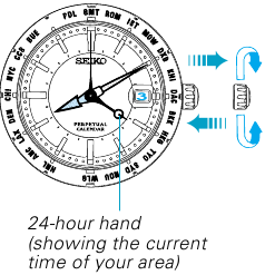 * Jūsų vietovės laiką galima sužinoti nuskaitant 24 valandų žymą ant ciferblato, į kurią rodo 24 valandų rodyklė.