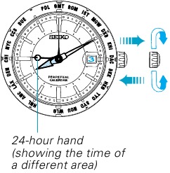 24 valandų rodyklė gali būti naudojama kaip AM/PM indikatorius, kuris apsisuka pilną ratą per 24 valandas, arba kaip dvigubo laiko rodyklė, rodanti zonos laiką kitoje laiko zonoje, kaip jums reikia.
