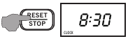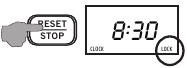 - Paspauskite ir palaikykite mygtuką RESET/STOP (nustatyti iš naujo/sustabdyti) maždaug penkias sekundes, po to pasigirs pyptelėjimas ir pasirodys LOCK (užrakto) indikatorius.