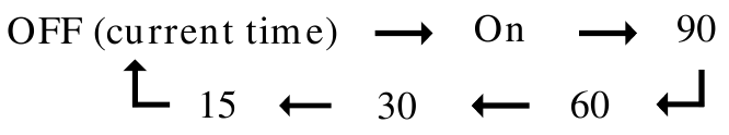 Radijas įsijungia. Jis išsijungs praėjus nustatytam laikui. Miego laikmatį galite nustatyti 90, 60, 30 arba 15 minučių. Kiekvienas paspaudimas keičia ekraną taip.
