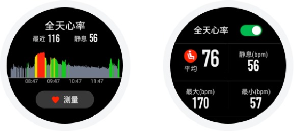 Įjungus visos dienos širdies ritmo režimą, "Heart Rate" (Širdies ritmas) programėlė rodys jūsų širdies ritmą per minutę (bpm), taip pat vidutinį širdies ritmą, maksimalų ir minimalų širdies ritmą bei ramybės širdies ritmą ne sporto būsenoje dienos metu. (Turite dėvėti laikrodį miegodami, kad galėtumėte gauti tokius įvertinimus.)
