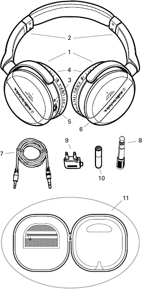 - Maitinimo jungiklis (įjungia triukšmo slopinimo funkciją, kai maitinimas įjungtas. Ausinės veikia kaip stereofoninės ausinės OFF (išjungta) padėtyje be aktyvios triukšmo slopinimo funkcijos.)