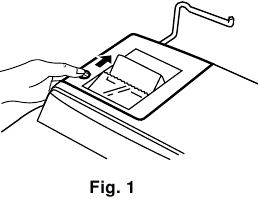 - Nuimkite spausdintuvo dangtelį, stumdami jį link skaičiuotuvo galo. (1 pav.)