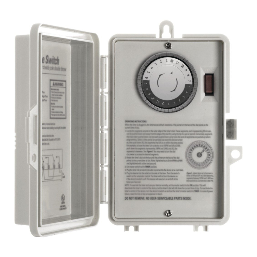 Prieš prijungdami laidus arba atlikdami techninę priežiūrą, maitinimas šiam laiko jungikliui ir jo valdomai įrangai turi būti išjungtas. Tik laiko jungiklio išjungimas neapsaugos nuo elektros smūgio pavojaus. Prieš tiekdami maitinimą laiko jungikliui, pakeiskite dangtelį korpuse. Jei jums nepatogu montuoti šį įrenginį, susisiekite su licencijuotu elektriku. Prieš montuodami šį gaminį, atidžiai perskaitykite visas instrukcijas.