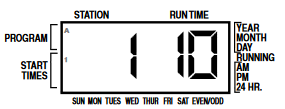 PASTABA: Stotis, kuri rodoma ekrane, kai pasukate ratuką į RUN (Vykdyti) padėtį, bus pirmoji paleista stotis. Tada valdiklis laistys tik nuoseklia tvarka. Jis nelaistys ankstesnių stočių. Pavyzdys: Jei pasukate ratuką į RUN (Vykdyti) padėtį, kai ekrane rodoma 3 stotis. Valdiklis laistys 3–9 programas, bet negrįš į 1 ir 2 stotis.