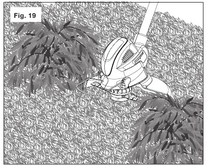 Jūsų žoliapjovė idealiai tinka pjauti vietose, kurių negali pasiekti įprastos vejapjovės. Pjovimo padėtyje laikykite "SharperBlade ™" lygiagrečiai žemei. Venkite spausti galvutę į žemę, nes tai gali nuskusti žemę ir sugadinti įrankį (19 pav.).