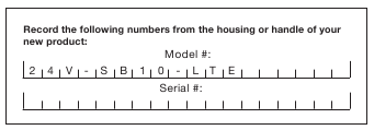 Susisiekdami su įmone, užsakydami dalis arba užsakydami aptarnavimą iš įgaliotojo pardavėjo, turėsite pateikti modelio ir serijos numerius, kuriuos galite rasti ant įrenginio korpuso esančios etiketės. Nukopijuokite šiuos numerius į toliau pateiktą vietą.