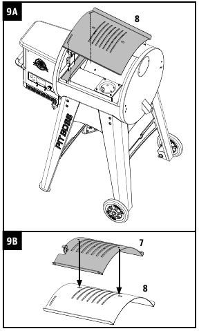 - Uždėkite liepsnos broilerio slankiklį ant liepsnos broilerio pagrindinės plokštės, uždengdami plyšines angas. Įsitikinkite, kad pakeltas skirtukas yra kairėje, o du kaiščiai liepsnos broilerio slankiklio apačioje įstatomi į liepsnos broilerio pagrindinės plokštės skylutes, kad būtų lengva reguliuoti tiesioginę ir netiesioginę liepsną gaminant maistą. Abi liepsnos broilerio dalys yra lengvai padengtos aliejumi, kad nerūdytų gabenant. Žr. 9B iliustraciją.
