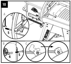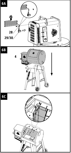 - Toliau atidarykite pagrindinės statinės dangtį. Prireikus sureguliuokite sukimąsi, kad sulygiuotumėte pagrindinės statinės varžtų skylutes su vežimėliu. Kai padėsite, pritvirtinkite kiekvieną koją prie pagrindinės statinės naudodami tris varžtus, poveržles ir fiksavimo poveržles. Žr. 6C iliustraciją.