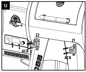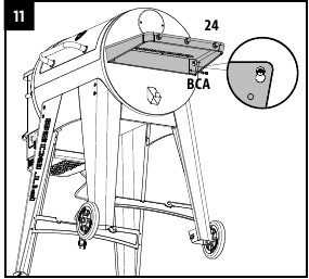 - Iš apačios pritvirtinkite dešinįjį šoninį staliuką prie pagrindinės statinės šoninio skydelio, naudodami du varžtus, poveržles ir fiksavimo poveržles.